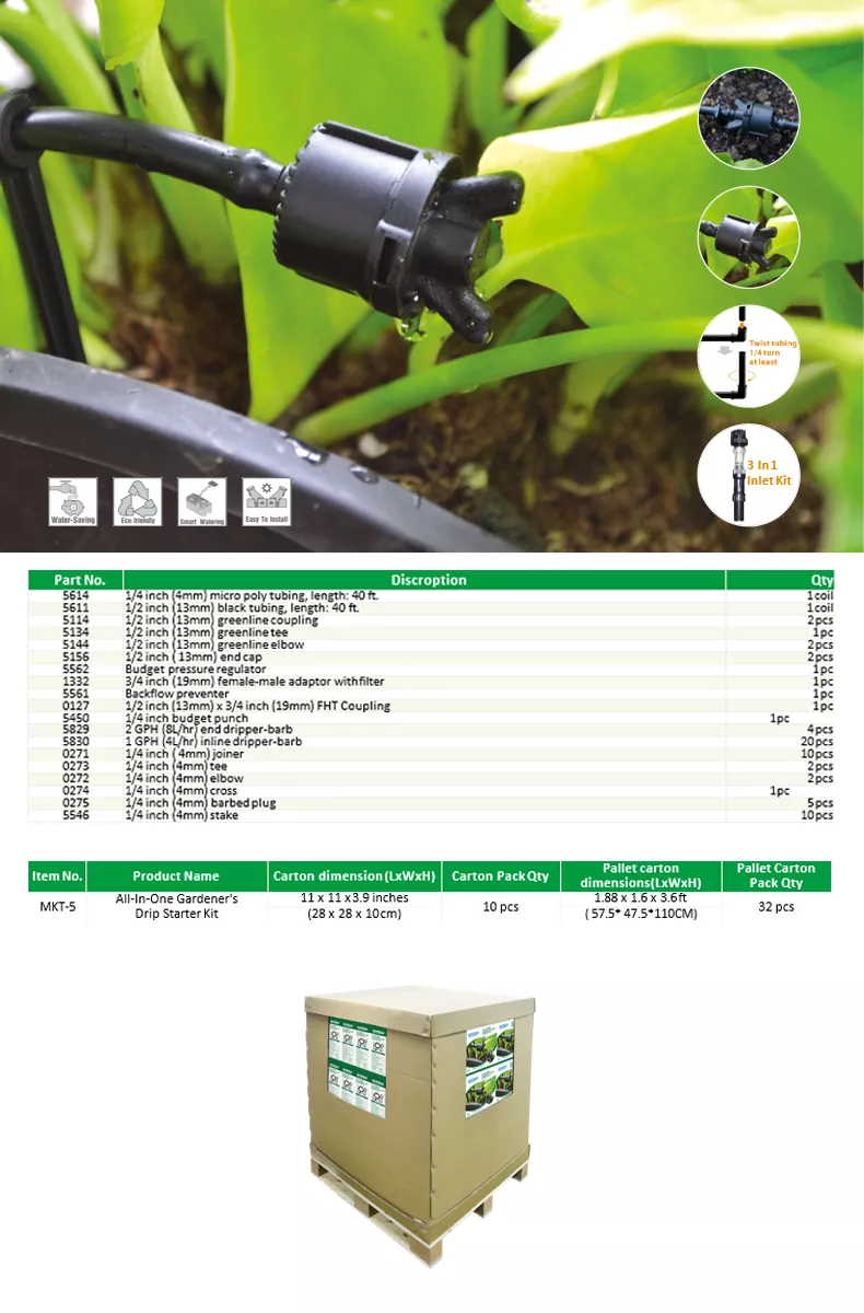 MMIP är en professionell tillverkare av All In One Gardeners Drip Starter Kit. Vi har strikt kontrollerat produktions- och leveransprocesserna för att säkerställa att produkterna du får är av högsta kvalitet. Med 20 års erfarenhet av utrikeshandelsexport är vi en pålitlig partner för dig.
