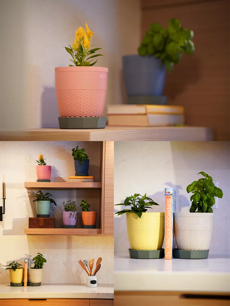 Det finns tre blomkrukor i olika storlekar i denna serie. 4-tumskrukan är den minsta, 5-tumskrukan är medelstor och 6-tumskrukan är störst. Varje blomkruka kommer med en vattenförvaringsbas.