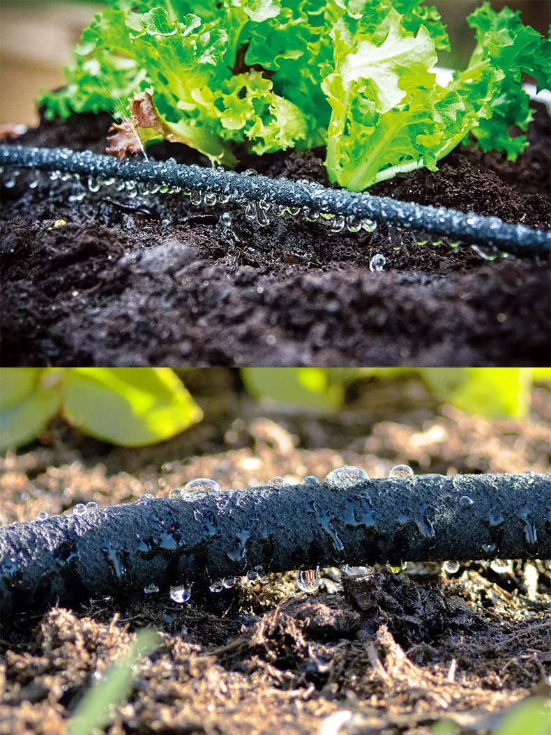 Egenskaper för sippslang: 1、 Grov struktur med mikroporer – Slangväggen känns grov vid beröring, med många fina porer för konsekvent vattenutsläpp. 2、Justerbar flödeskontroll – Vatteneffekten kan regleras med flödesbegränsare (öppningsplattor). 3、Emission i full längd – Hela slangen släpper ut vatten jämnt, vilket möjliggör direkt placering längs plantans rotzoner för riktad bevattning.