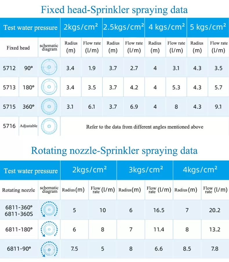 Våra produkter täcker två typer av sprinklers: roterande och fasta. Både roterande och fasta sprinklers erbjuder vinkelalternativ som 90°, 180° och 360°, tillsammans med anpassningsbara vinkelsprinkler för inomhusbruk, kan de möta behoven för olika bevattningsscenarier från fasta områden till flexibla justeringar, från små hörnområden till stora hela ytor, utan att behöva köpa ytterligare utrustning.