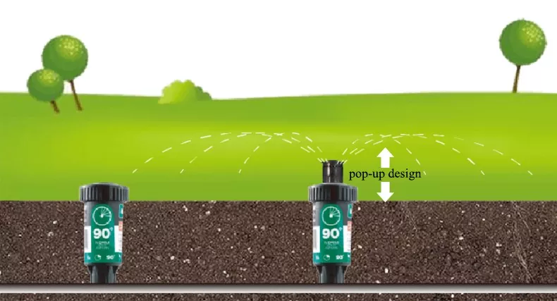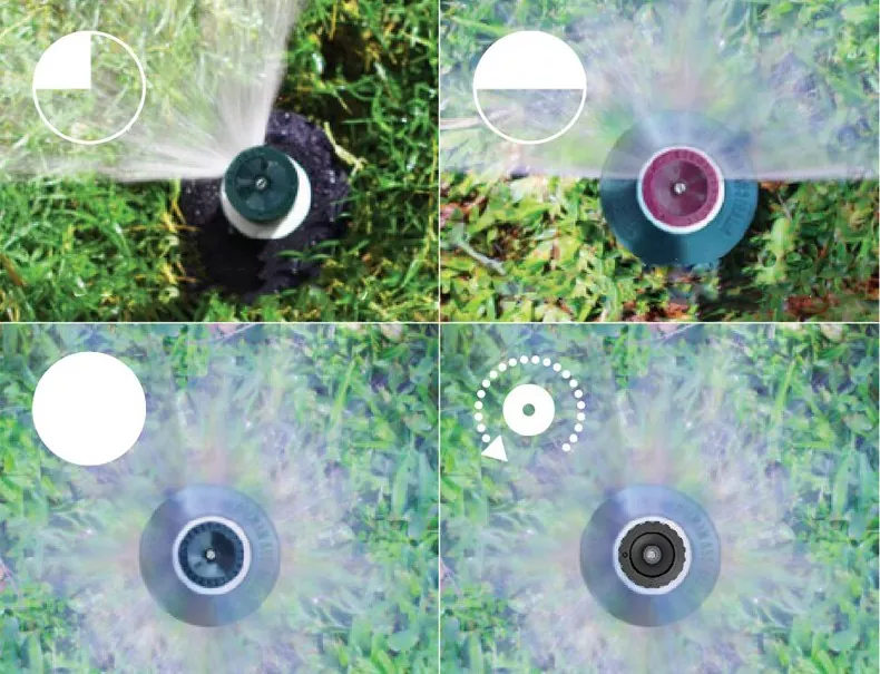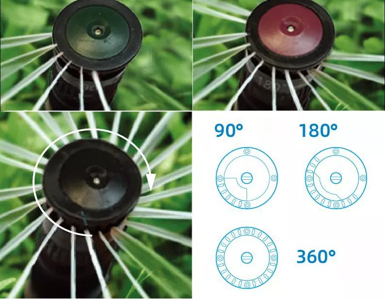 Tre alternativ för roterande sprinkler: 90°、180°、360° Dessa gräsbevattningssprinkler erbjuder utmärkt vindmotstånd och bred täckning, med ett maximalt sprutavstånd på upp till 7,1 meter. De producerar en fin, dimmliknande spray, vilket gör dem idealiska för bevattning av stora gräsmattor, trädgårdar och liknande områden.