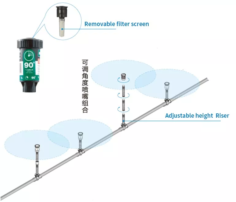MMIP underjordiska sprinkler har en utbytbar munstycksdesign. Den universella sprinklerbasen tillåter användare att välja lämpliga munstycken enligt kraven på olika platser. Den avtagbara filterskärmen är lätt att rengöra. Dessutom kan den kombineras med stigare och motsvarande tillbehör för att skapa sprinklersystem på olika höjder.