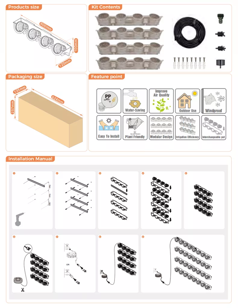 Vertical Garden Start kit är ett snabbt och enkelt startpaket för husägare som vill bygga upp en vertikal trädgård med Watex Professional Green Wall System. Detta kit innehåller 4 hängande ränder, 4 av watex #8 krukor och 16 av innerkrukor