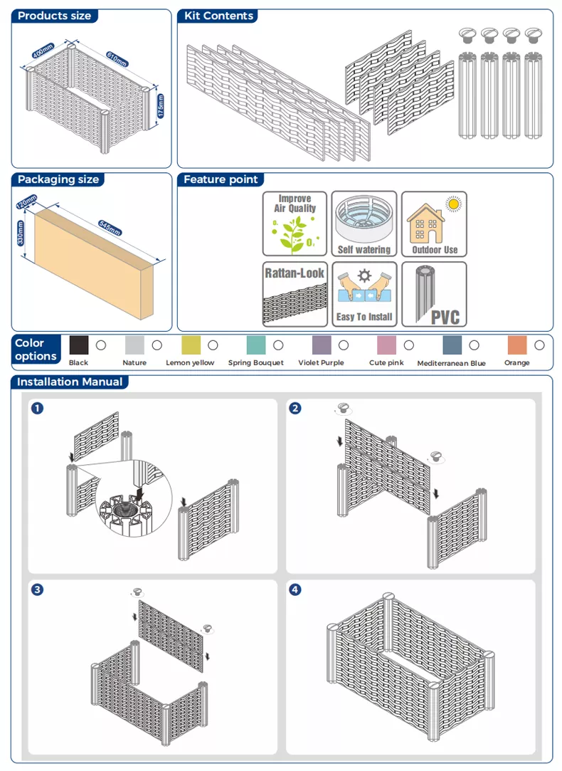 Varje rektangulär trädgårdssäng i immolrattan plast levereras med en detaljerad illustrerad monteringsanvisning, som tydligt markerar installationsstegen och försiktighetsåtgärderna för varje komponent. Om du stöter på några frågor under monteringsprocessen kan du kontakta oss när som helst via kundtjänst online, officiell hotline eller andra kanaler, vi kommer att tillhandahålla en-till-en video- eller textvägledning för att säkerställa att du slutför installationen smidigt.