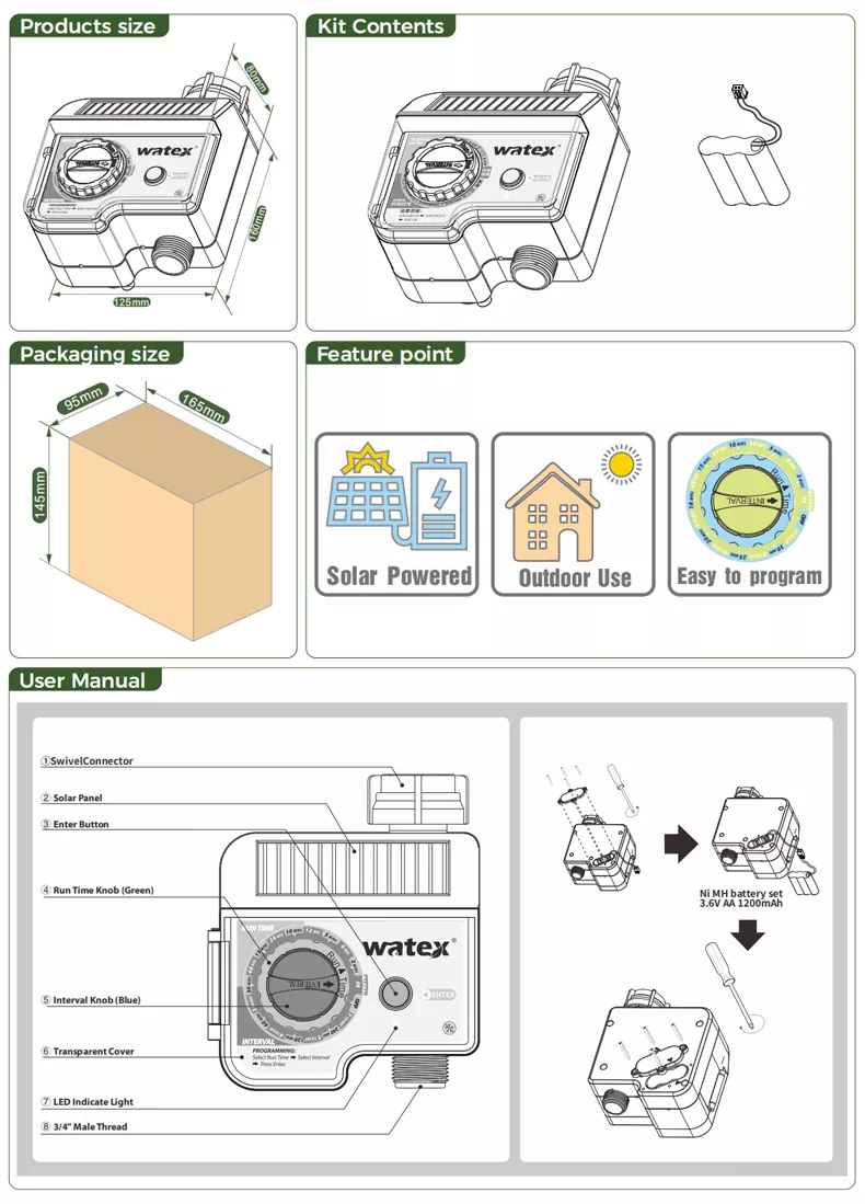 Jämfört med liknande produkter behöver solcellsdriven krantimer inte ofta byta batterier (vid normal användning). Det är miljövänligt och energieffektivt. Den har tillräcklig kraft och är hållbar, vilket gör den till en bevattningsanordning som låter dig resa i affärer med sinnesfrid.