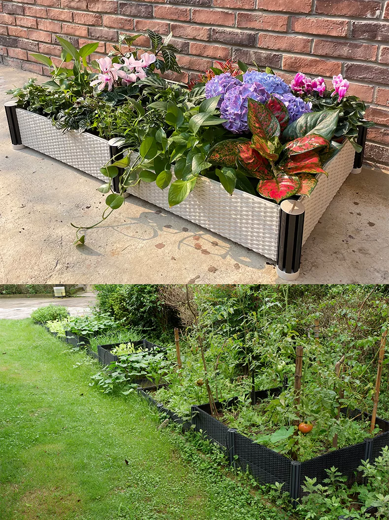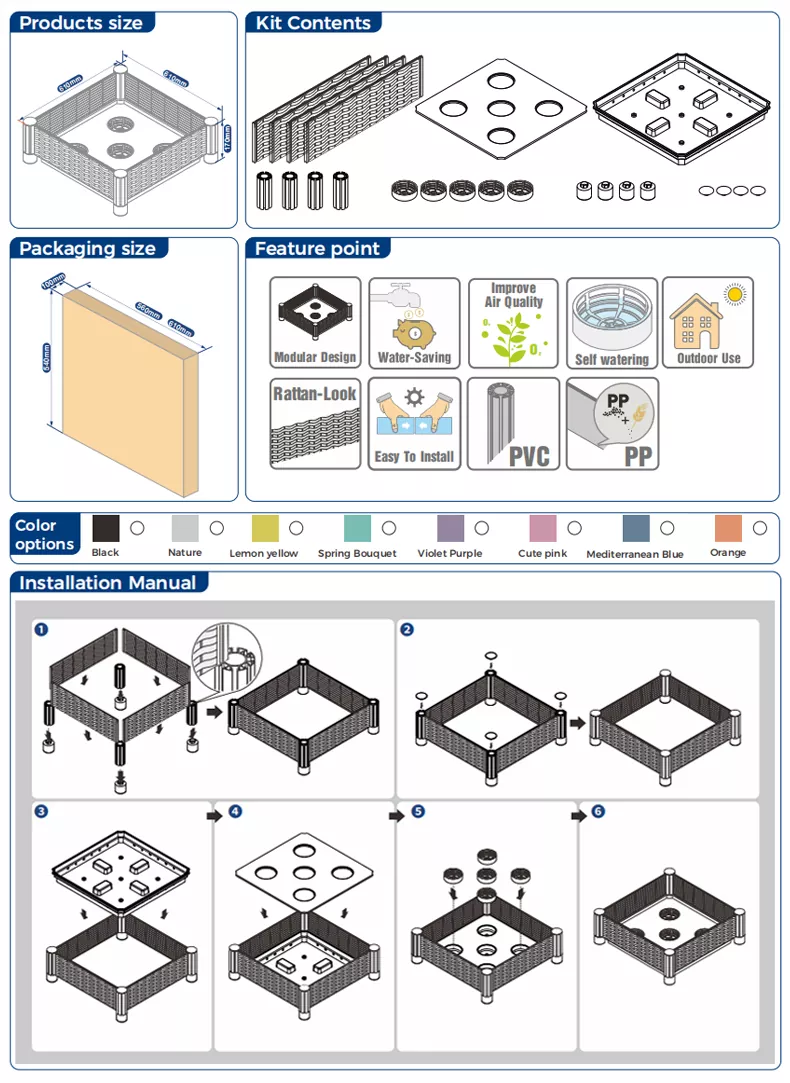 Material och hantverk: Fyrkantig trädgårdssäng i rottingplast är gjord av högkvalitativ PP/PE-plast med överlägset utförande. Produkterna uppfyller EU/USA kvalitetscertifieringar för exportmarknader.
